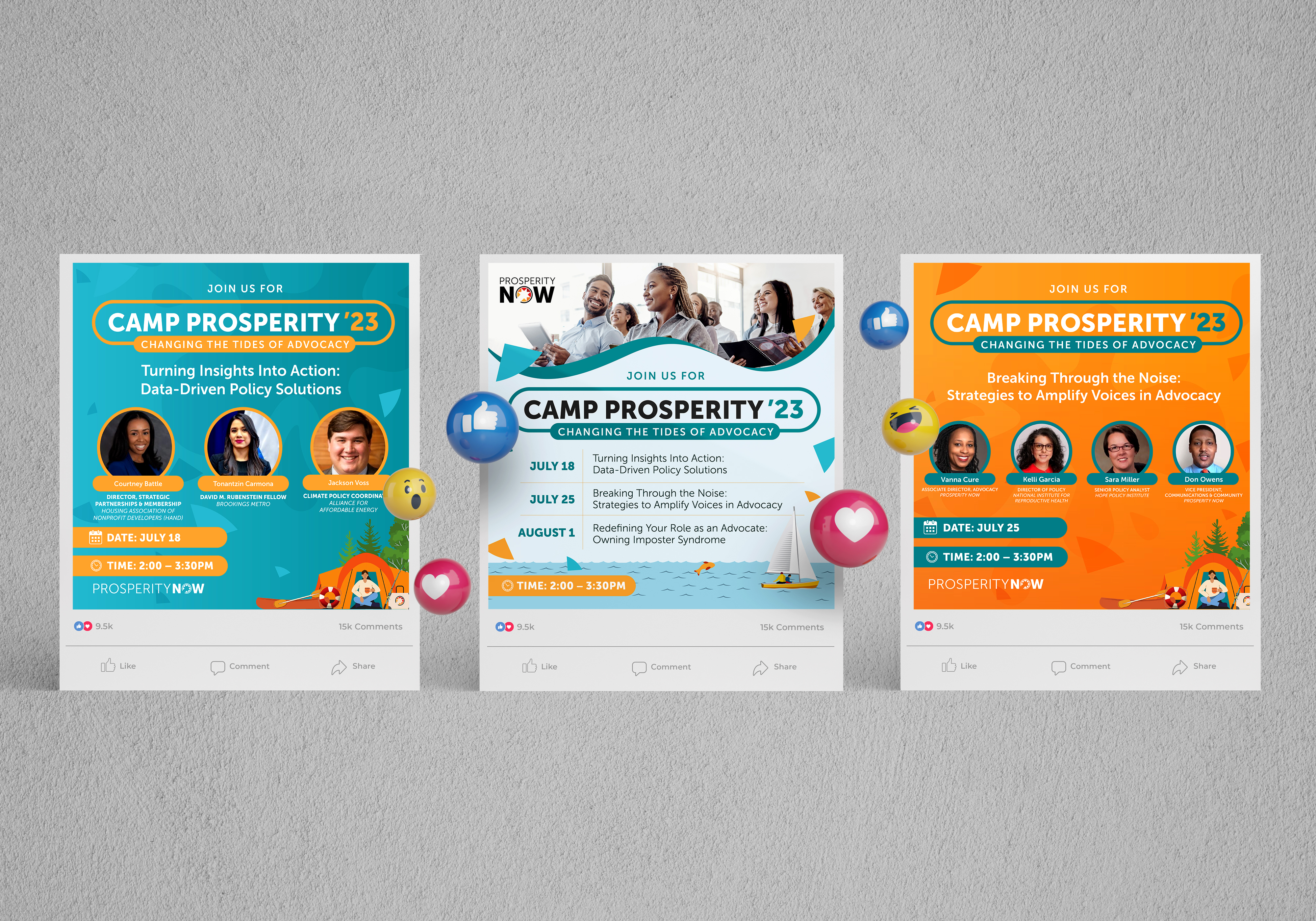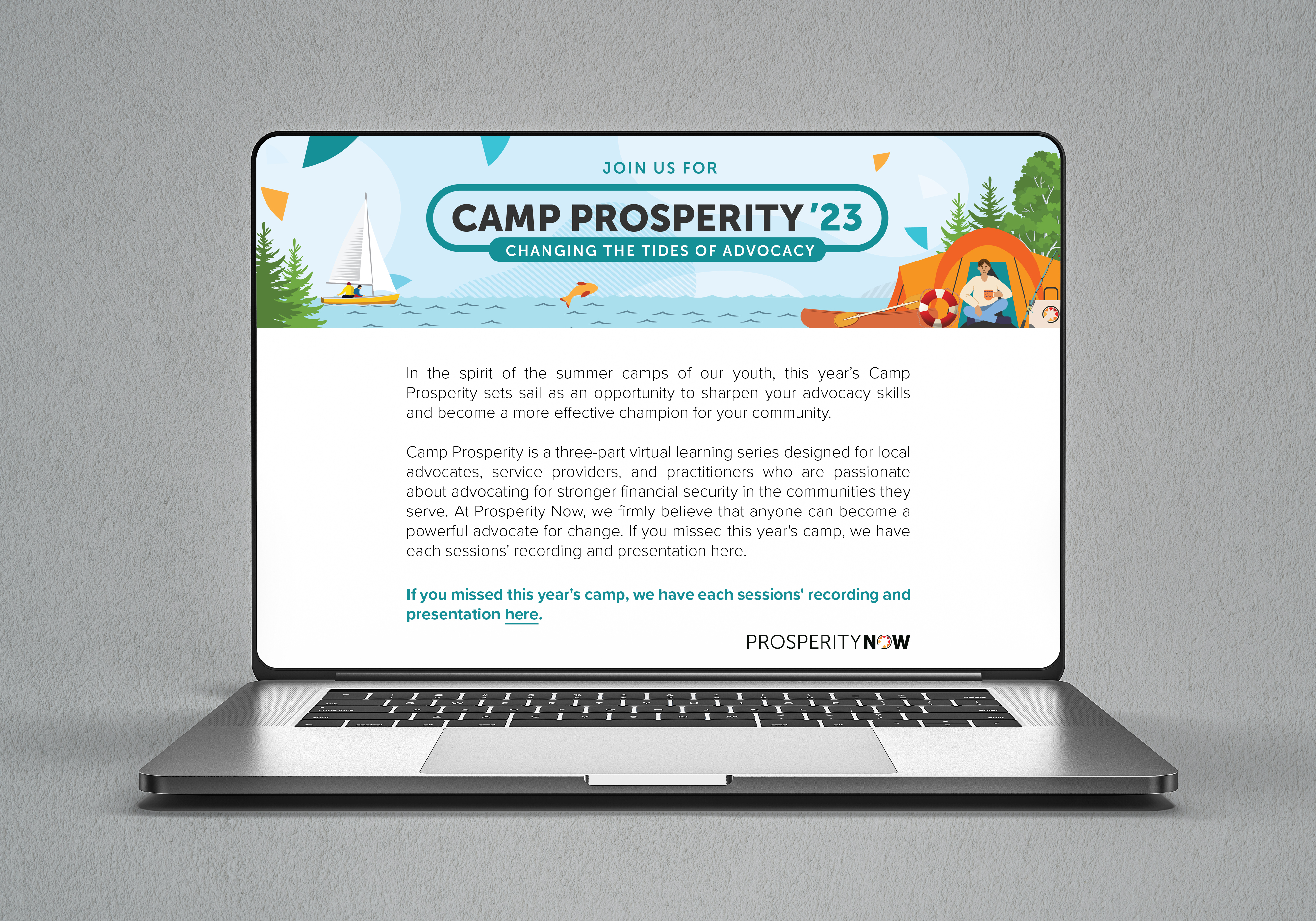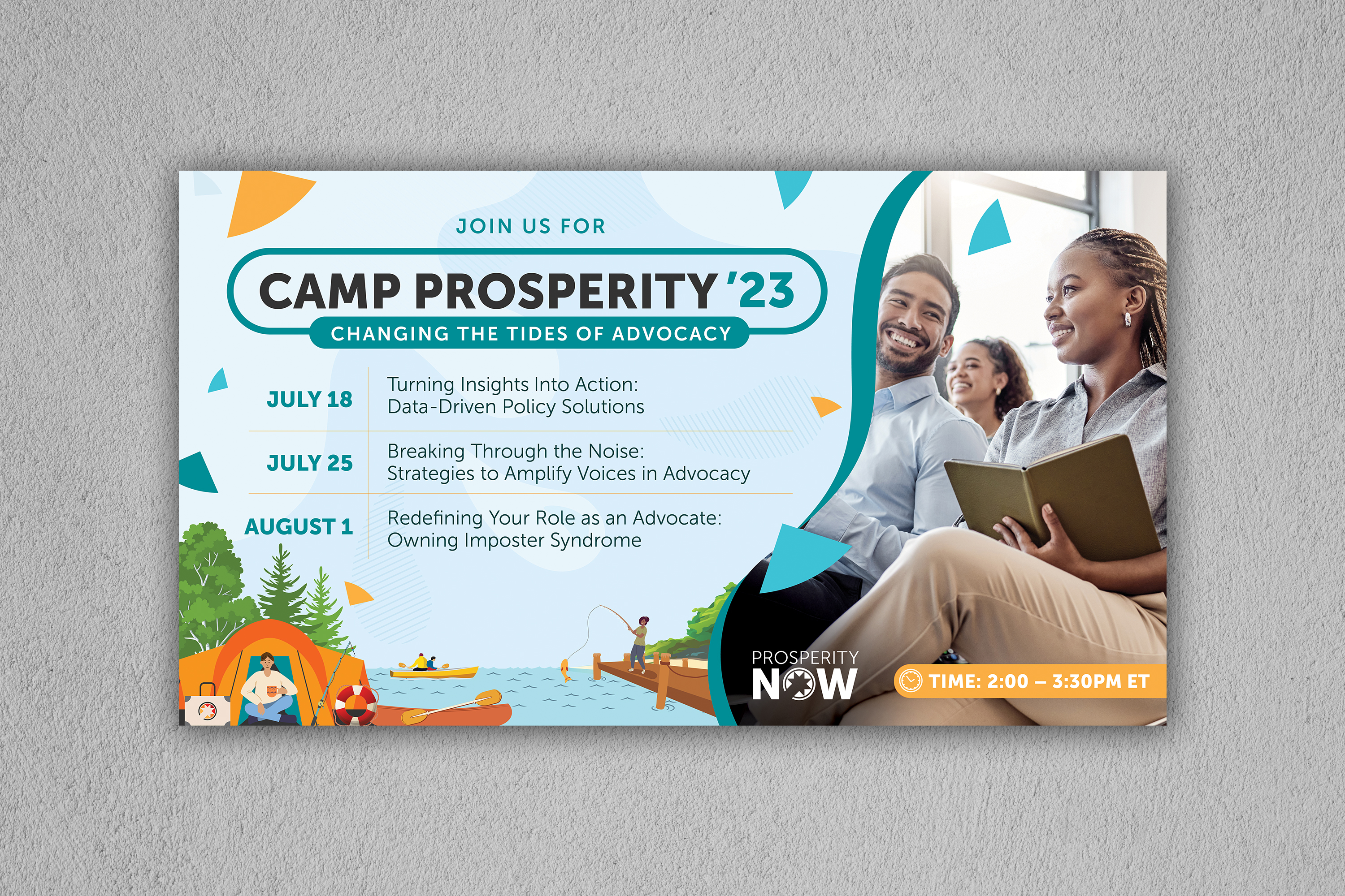 Camp Prosperity is a three-part virtual learning series designed for local advocates, service providers, and practitioners who are passionate about advocating for stronger financial security in the communities they serve. I designed the custom graphics and illustrations for these webinars, which included: hero graphic, email banner and three sets of social media graphics for each week of the series.