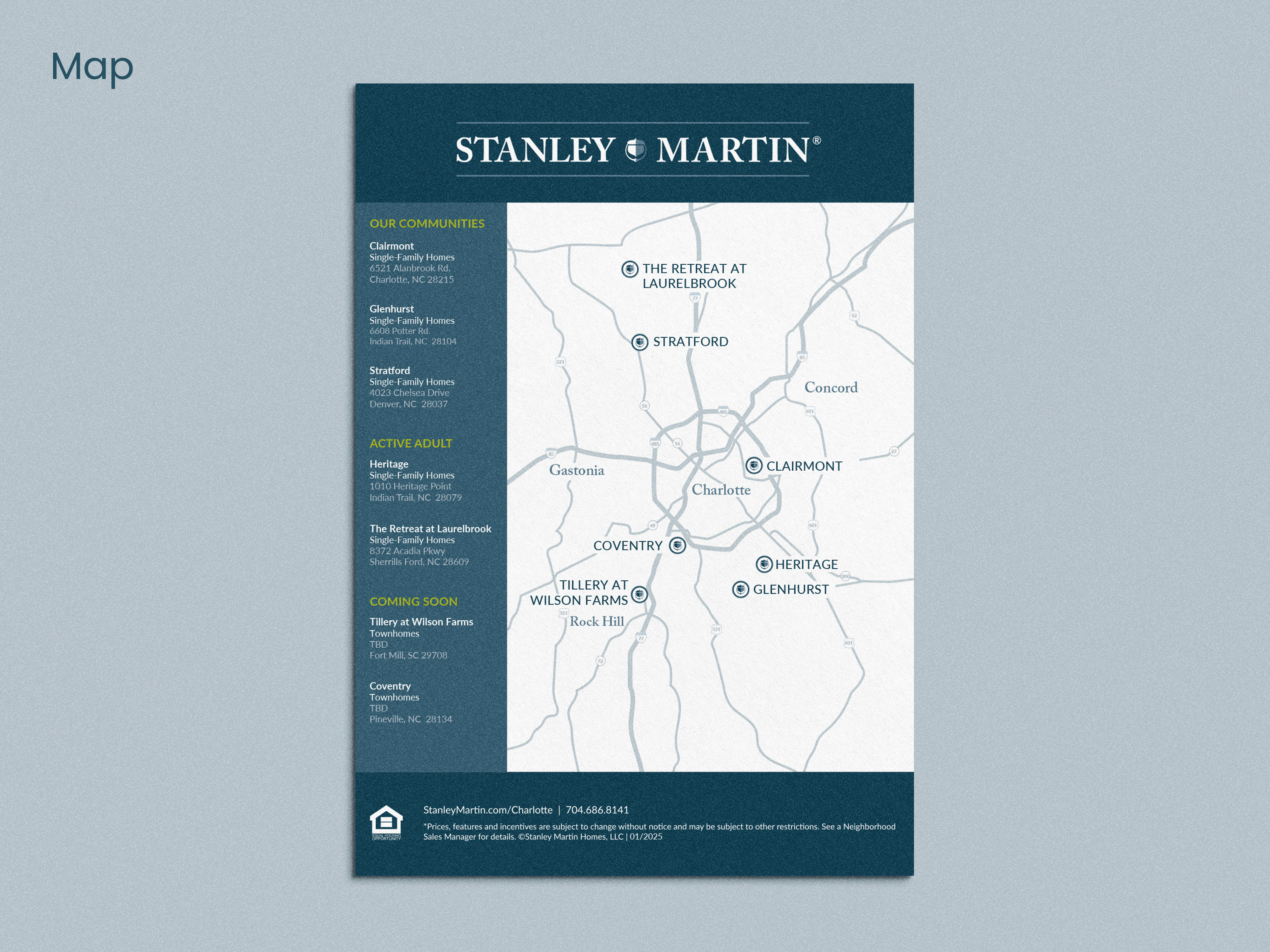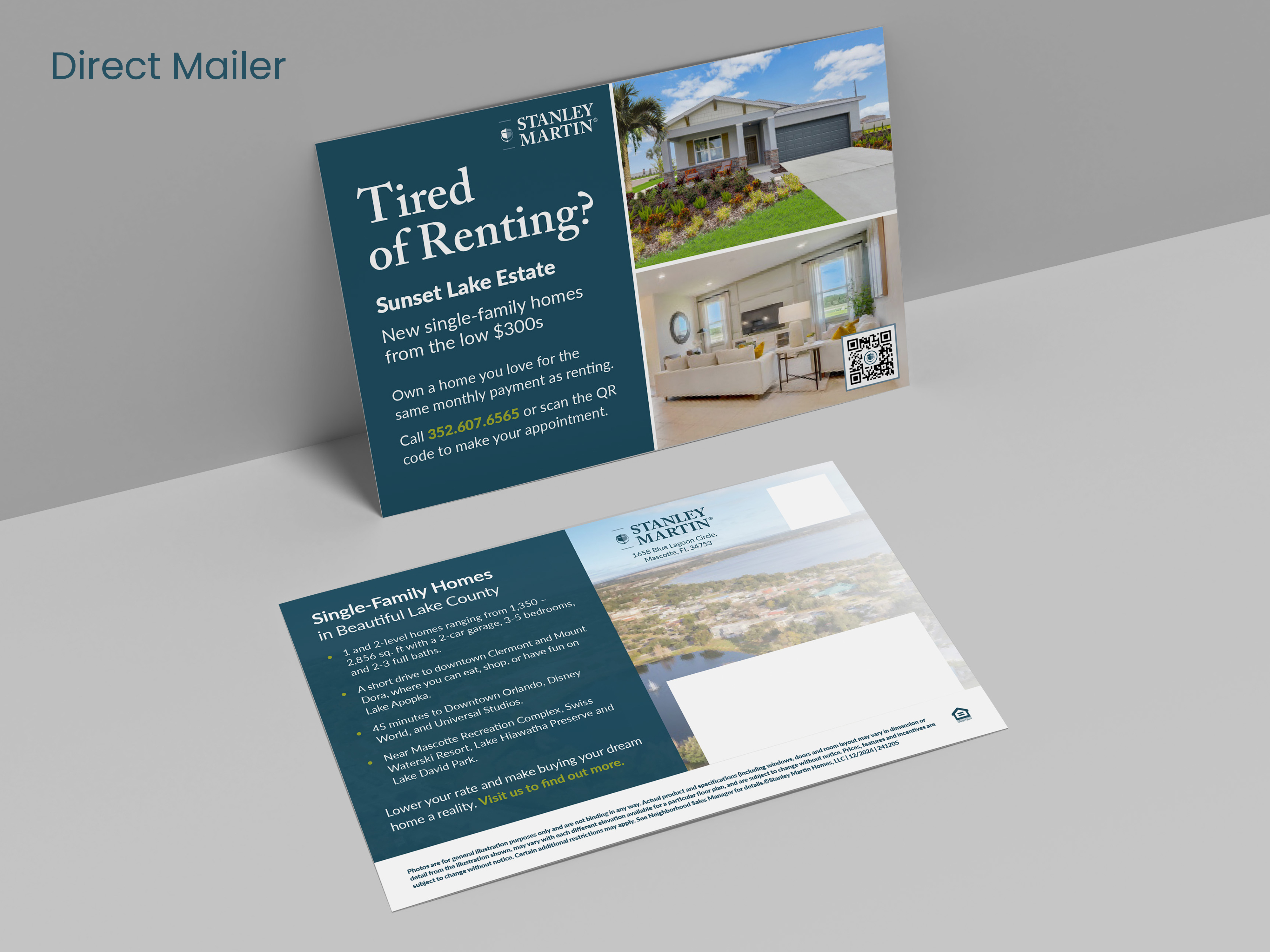 As a Graphic Designer at Stanley Martin Homes, I was responsible for creating a wide range of compelling visual materials to support the company’s marketing and sales initiatives. My work included designing large-scale billboards that aligned with brand standards and captured attention across high-traffic areas, as well as developing direct mail print pieces that promoted new communities and special offers to targeted audiences. I produced cohesive signage packages for model homes and sales centers, ensuring a seamless and branded customer experience on-site. Additionally, I contributed to the production of video content, including editing promotional and community-focused videos that enhanced digital engagement and storytelling across social platforms and online campaigns.