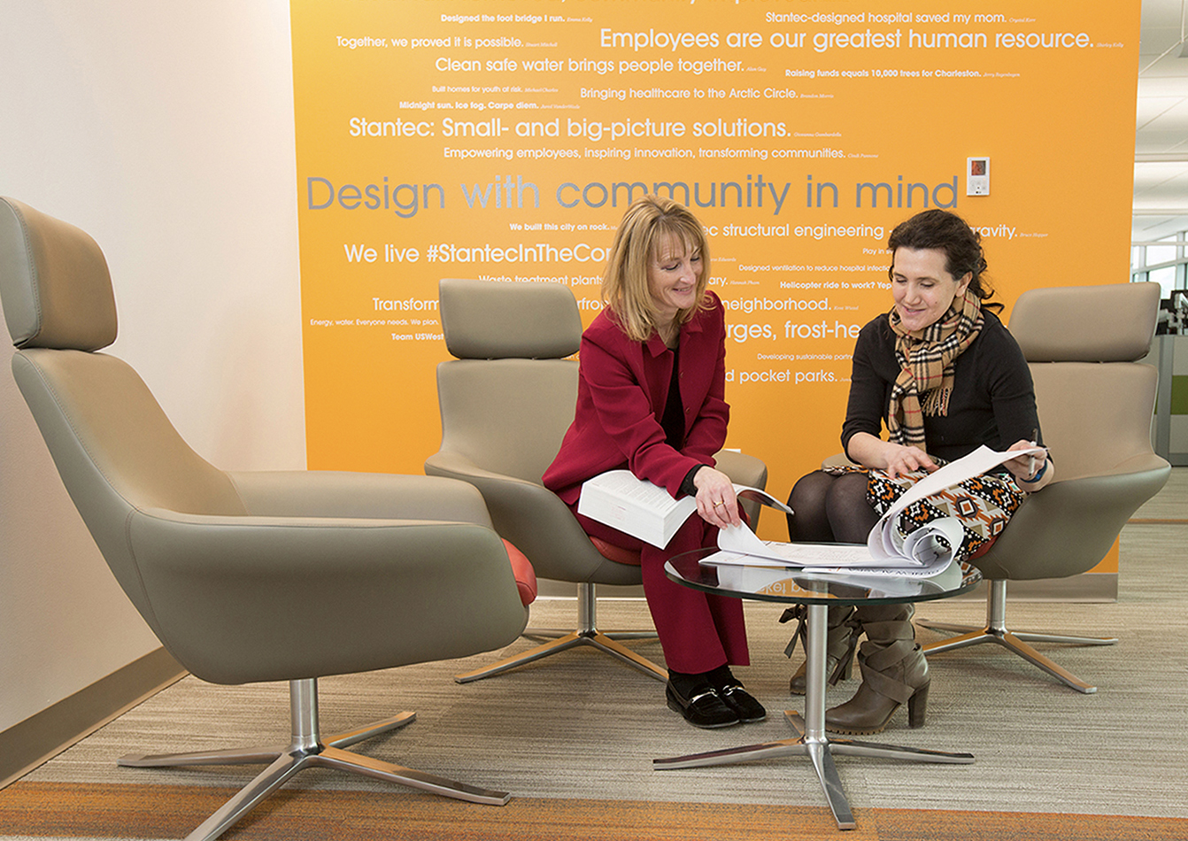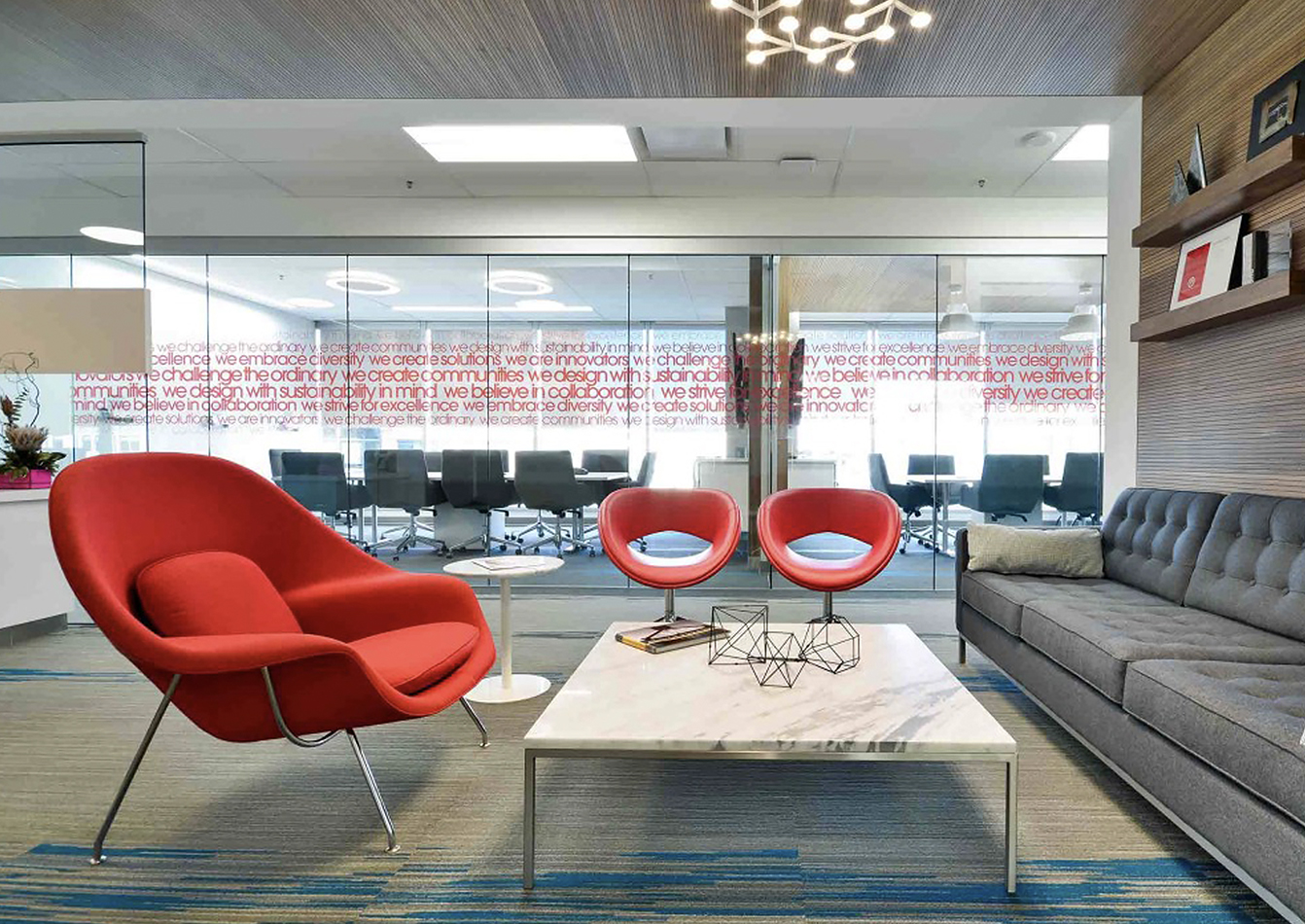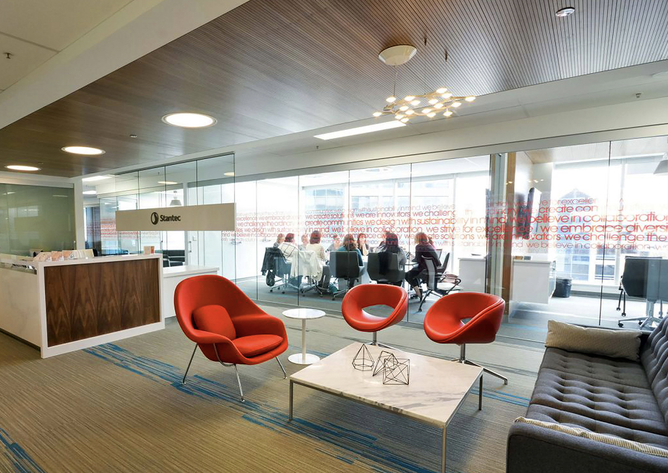 As part of the company re-brand effort Stantec’s offices revamped their interiors with a sleek, community-driven wall graphic featuring the company’s values combined with employees’ six-word stories describing their vision for the company and its community impact. The Stantec story wall reflects the culture and projects at Stantec. Variations of the wall graphics were implemented throughout the Mid-Alantic Region and adapted in offices across the company.